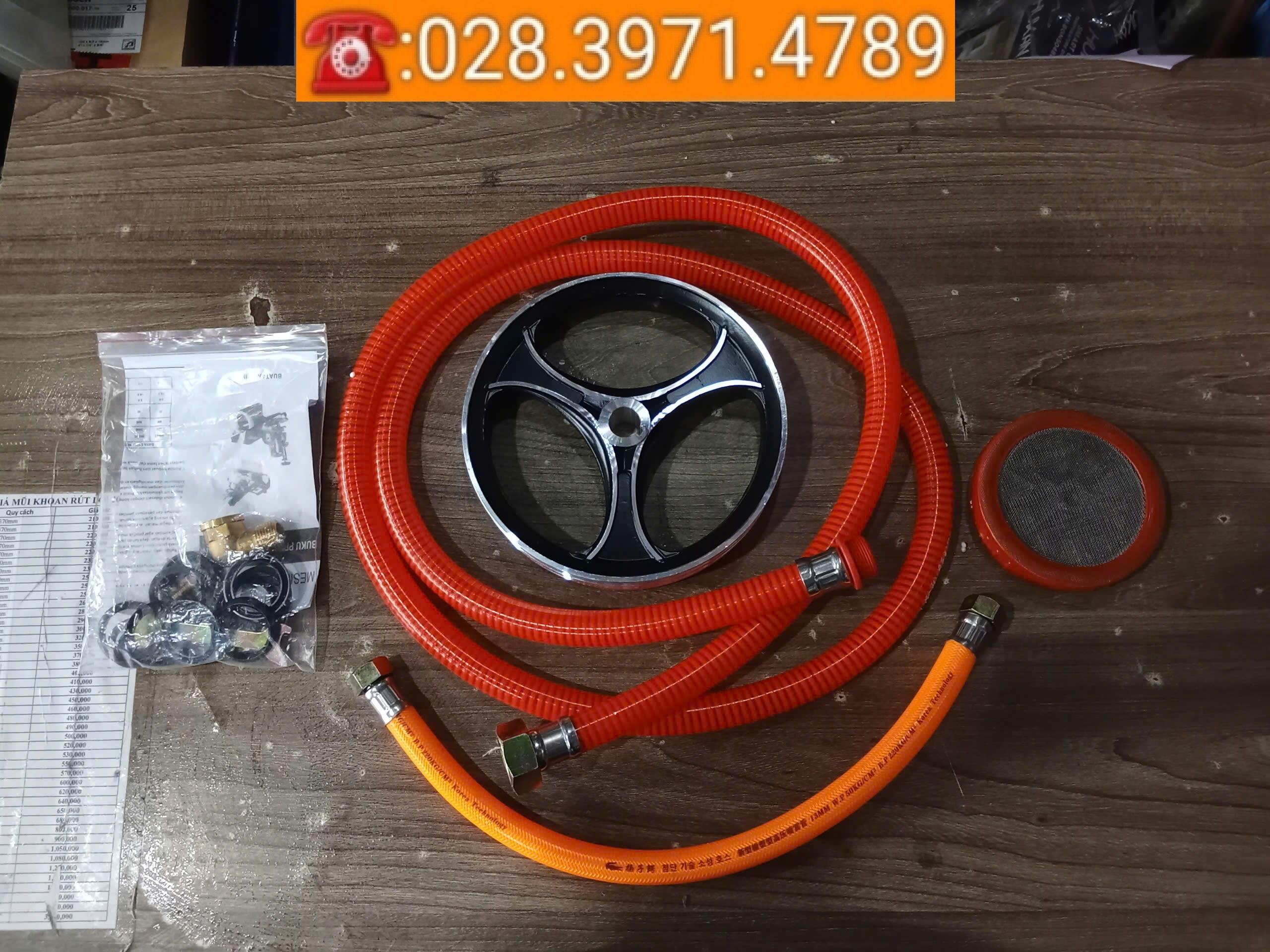 Phụ kiện kèm theo máy: Dây hút, dây hồi, puly rời, lọc rác, bộ phớt nước, bộ túi ốc, vít, dụng cụ sửa chữa