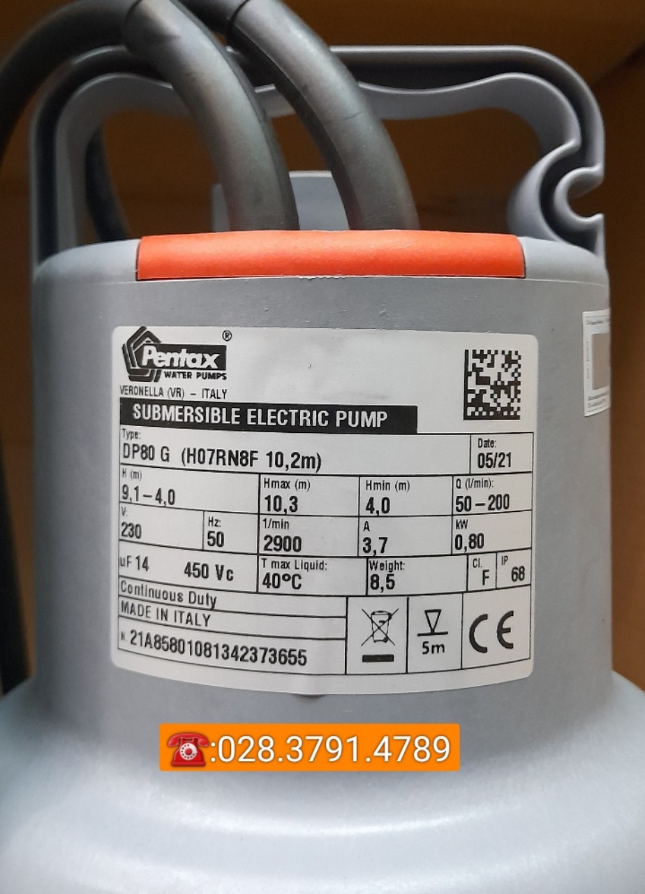 Máy bơm nước thải Pentax DP 80G được nhập khẩu nguyên chiếc từ Italy với đầy đủ chứng nhận xuất xứ và chất lượng sản phẩm (CO, CQ). Máy được bảo hành chính hãng trong 12 tháng theo đúng tiêu chuẩn của Pentax Italy.